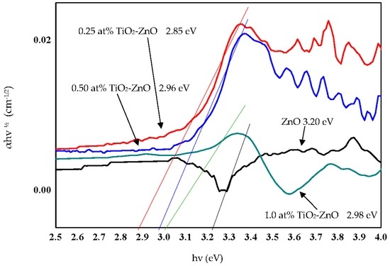 Tauc plot of ZnO, 0.25 at % TiO2-ZnO, 0.50 at % TiO2-ZnO, and 1.0 at % TiO2-ZnO.