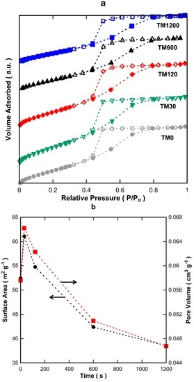 (a) Nitrogen adsorption isotherms (full symbols for adsorption and hollow symbols for desorption); (b) Brunner-Emmett-Teller (BET) surface area and pore volumes; and (c) pore size distribution of titania membranes (TM) xerogels exposed to varying vacuum times.