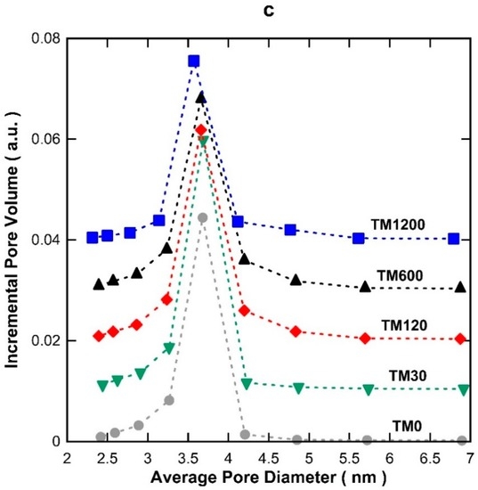 The X-ray diffraction (XRD) patterns of all the calcined TM samples in Figure 2 display five sharp distinct peaks at 25.7°, 37.4°, 48.3°, 54.1°, and 55.4° 2θ, which corresponds to crystallite reflections of {101}, {004}, {200}, {105} and {211} of titania material assigned to TiO2-anatase (JCPDF-894121; I41/amd space group symmetry) [23]. The Scherrer equation was used to calculate the average TiO2-anatase crystallite size based on the peak width at half maximum of the {101} reflection [24], and the results are listed in Table 1. The crystallite size of the anatase titania was calculated to be 12.2 nm for the TM0 sample but reduced to 11.5 nm for the TM30 sample. By further increasing the vacuum time, the crystallite size of the anatase titania increased systematically to a maximum value of 12.9 nm for the TM1200 sample. These features are also consistent with the BET surface area and pore volume trends observed in Figure 1b.