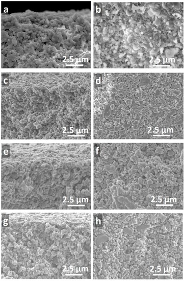 Representative scanning electron microscopy (SEM) images of a blank alumina support and three titania membranes with one, two, and three layers of titania prepared at 1200 s of vacuum exposure (TM1200-1L, TM1200-2L, and TM1200-3L) are shown in Figure 3. From these images, titania thin films could not be observed on the top of any of the alumina substrates. This suggests a significant impregnation of the titania sol upon contact with the dry porous alumina substrate, and/or to the vacuum exposure of 1200 s. On closer inspection of Figure 3g,h, only the TM1200-3L membrane appeared to compose of a very light coverage of titania as a result of the multiple dip-coating and vacuum process to form a thicker and more compact film with smaller particles on the top surface.