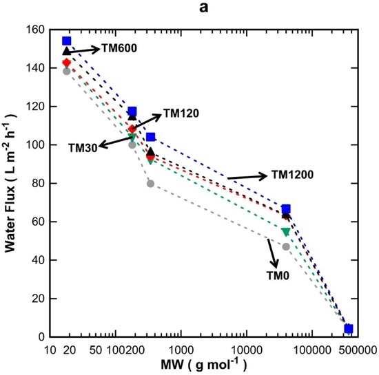 Single layer TM membranes at different vacuum times (a) flux and (b) percentage of rejection as a function of molecular weight (MW) for TM0 (grey circles), TM30 (green inverted triangles), TM120 (red diamonds), TM600 (black triangles) and TM1200 (blue squares).