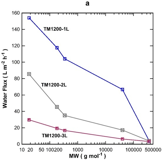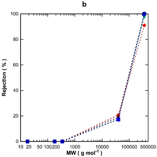 Molecular weight (MW) cut-off studies were carried out in aqueous solutions containing 3000 ppm concentrations of glucose, sucrose, and polyvinyl pyrrolidine (PVP molecular weights of 36 kDa and 400 kDa). The samples collected from the permeate stream were analysed using a Shimadzu UV-2700 UV-Vis spectrometer (Shimadzu Corporation, Kyoto, Japan) to determine their concentration against calibrated curves. The rejection (R) of substances was calculated using the following equation: R = [1 − (Cp/Cf)] × 100, where R (%) is the rejection, and Cp and Cf are the concentrations of the samples collected from the permeate and feed streams, respectively.