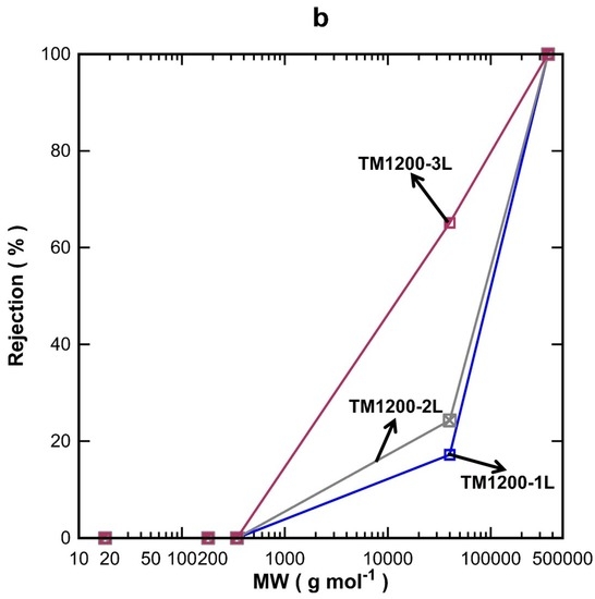 The MW cut-off testing was also carried out on the titania membranes prepared with one, two, and three coated-layers exposed for 1200 s of vacuum. Overall, the water flux permeation in Figure 5a decreased with increasing the MW of the organic substances, which is in good accord with the results for the TM1200 membrane vacuum series. TM1200-1L (single layer) gave the highest flux for all the tested organics compared to two and three layered TM membranes, of which their fluxes reduced sequentially as the number of layers increased to two and three layers. These results clearly indicate that the number of coating layers increased the mass resistance and thus decreased the flux. By plotting the rejection results as a function of the MW (Figure 5b), it was observed that the rejection increased with the number of titania coating as well as the MW of the organics, which is in concert with similar trends discussed for Figure 4b. The TM1200-1L membrane with a single layer revealed the lowest rejection of 17% for PVP-40 kDa as compared to two and three layer membranes. The TM1200-3L membrane delivered 65% rejection for PVP-40 kDa, thus suggesting the membrane pore sizes are reduced as more layers are added to the TM membranes. Indeed, it is very likely that by increasing the number of layers, the membrane pore sizes gradually narrowed, thus causing interlayer pore wall thickening. Finally, values close to 100% rejection were measured for PVP-360 kDa for all TM membranes, which demonstrates that the membrane pore sizes of these TM membranes are much smaller than the PVP-360 kDa molecules.