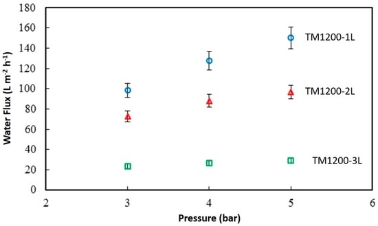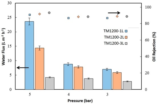 Water flux of the TM1200-1L, TM1200-2L, and TM1200-3L membranes tested with oil emulsion (3000 ppm of hexadecane) at 60 min of filtration.