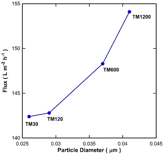It is well known that the void between the particles increases as the particle size increases. To examine this theory, the particle size in Table 2 were plotted against the pure water flux for the TM membranes with a single titania coating exposed to different vacuum times as shown in Figure 8. It is clearly observed that there was a good fit between the particle size and the water flux. As the particle size of titania increases, the water flux of the TM membranes increases. These results therefore strongly suggest that the vacuum time played an important role in changing the particle size of the titania, which in turn alters the inter-particle voids and thus affects the membrane resistance to water transport across the membranes.