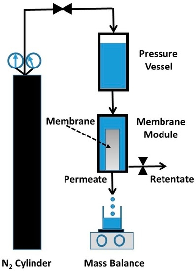 The titania membranes were tested for water permeation and the rejection of organic substances, and oil/water separation, using a dead-end (i.e., closed retentate stream) permeation rig, as schematically shown in Figure 10. The aqueous solution column in pressure vessel was pressurised using nitrogen gas to desired pressures. This set up emulates the effect of pumps, so the pressure of the feed side is higher than that of the permeate side, thus providing the driving force (i.e., pressure gradient) required for the permeation of water through the membrane. The permeate was collected in a beaker on an electronic scale linked to a computer, so the permeate mass could be determined as a function of time to calculate the water flux as J = ∆W/A∆t, where J (L·m−2·h−1) is the water flux, ∆W (kg) is the permeated mass collected over a predetermined time ∆t (h) at steady state, and A (m2) is the titania membrane area.