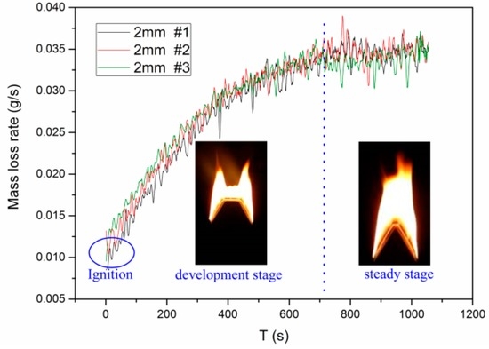 - Zhao, K.; Zhou, X.; Yang, L.; Gong, J.; Wu, Z.; Huan, Z.; Liu, X. Width effects on downward flame spread over poly(methyl methacrylate) sheets. J. Fire Sci. 2015, 33, 69–84. [Google Scholar] [CrossRef]