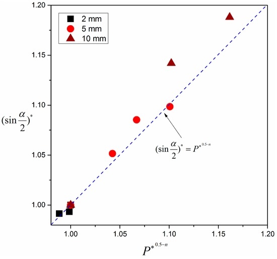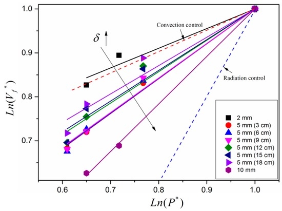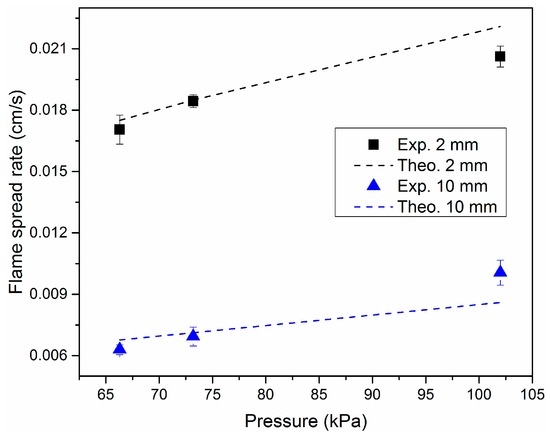 - The changing trends of angle of the pyrolysis front with pressure for samples with different thicknesses are distinctly different. For the 2 mm sample, the angle of the pyrolysis front hardly changed with pressure. In contrast, for a larger sample width, this angle decreases significantly with increasing pressure, which in turn will increase the length of the burning region. Through the derived correlation of 3-D flame spread rate, a normalized formula for the angle of the pyrolysis front with pressure was proposed, , which coincided well with experimental results in this study.