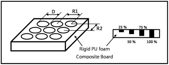 PU foam is composed of polyol and MDI at different ratios, and the optimal ratio is determined to be 1:1. Polyol and MDI are blended and mixed at a speed of 600 rpm for 30 s. The mixture is poured into a mold with dimensions of 300 mm × 300 mm × 20 mm to achieve a specific volume density. The mold is cooled at room temperature for 120 min, while the mixture is solidified to form PU foam plates. The specific density of PU foam plates is 60 kg/m3. The plates are perforated, creating pores with a diameter of 1 mm. The perforation rates are 0%, 1%, 3%, and 5%, the perforation depths are 25%, 50%, and 75%, and the plates’ thickness is 100%. The PU plates that have different perforation conditions are tested for drop-weight impact and sound absorption coefficient. Figure 1 shows the perforation conditions. The perforation rate and pore location are computed using Equation (1).