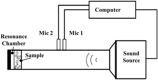 As specified in ASTM E1050-12, a two-microphone impedance tube (Automotive Research & Testing Center, Taipei, Taiwan) is used to measure the sound absorption coefficient of the PU foam plates at a frequency between 125 and 4000 Hz (Figure 2). Samples are cut into circular sections with a diameter of 38 mm. Three samples for each specification are used for this test. During the test, samples are placed in the tube, and the distance from the end of the tube to the sample is varied at 0, 5, 10, 15, and 20 mm. This particular parameter is hereafter referred to as resonance chamber size. When the samples are perforated at a depth of 100%, the tunnels formed in the PU foam plates and the sealed resonance chamber compose the Helholtz resonance structure [31], thereby attaining different acoustic effects according to the cell and compression resonance. Sound absorption average (SAA) is determined by the arithmetic average of twelve one-third octave frequency band acoustic absorption coefficient values from 1500 through 4000 Hz. As samples are prepared according to the diameter of the two-microphone impedance tube, more precise results can be obtained with further tests (e.g., anechoic chamber) on samples in end-use dimensions. Like sound absorption coefficient, noise reduction coefficient (NRC) is also an overall evaluation of the sound absorption ability of a specified material within a closed space and is the mean of the sound absorption coefficients at 250, 500, 1000, and 2000 Hz.