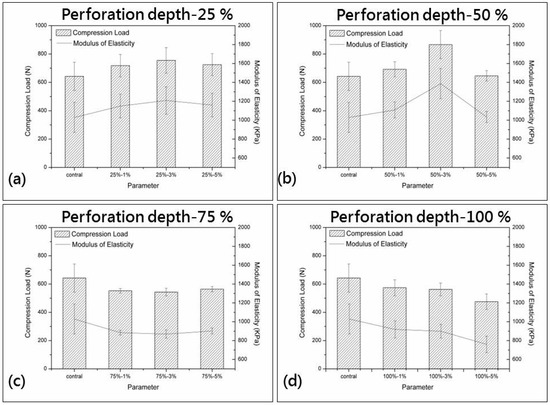 Compression load of PU foam plates in relation to perforation depths of (a) 25%; (b) 50%; (c) 75%; and (d) 100%.