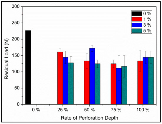 Residual load of PU foam plates in relation to perforation rates (0%, 1%, 3%, and 5%) and perforation depths (25%, 50%, 75%, and 100%).