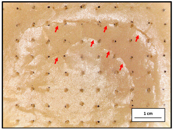 Figure 4 shows the residual load of PU foam plates in relation to different perforation rates of 0%, 1%, 3%, and 5% and perforation depths of 25%, 50%, 75%, and 100%. The test results indicate that the perforated PU foam plates exhibit lower residual load than the non-perforated ones. The structure of the plates is damaged as a result of undergoing perforation; as a result, the plates become less supportive. A comparison with the non-perforated samples indicates that the perforated PU foam plates exhibit greater extrusion deformation and collapse of the pores caused by perforation when an instant impact is applied. Furthermore, the area between pores caused by perforation also generates cracks, which dissipates more of the impact energy (Figure 5). In addition, variations in perforation rate and perforation depth do not lead to a significant difference in the residual load of the perforated samples. As a result, perforated PU foam plates exhibit higher absorption characteristics of impact energy in comparison to the non-perforated samples. In particular, the lowest residual impact load of 110.4 N occurs when the perforated plates are made with a perforation depth of 75% and a perforation rate of 3% during the 9000 N drop-weight impact test. ANOVA results indicate that neither perforation rate nor perforation depth pertains to the drop-weight impact behavior of the PU foam plates (p > 0.05).