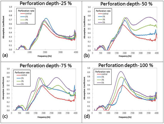 Sound absorption coefficient of PU foam plates in relation to perforation depths of (a) 25%; (b) 50%; (c) 75%; and (d) 100%.