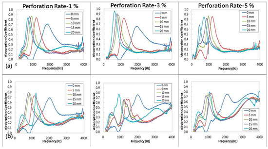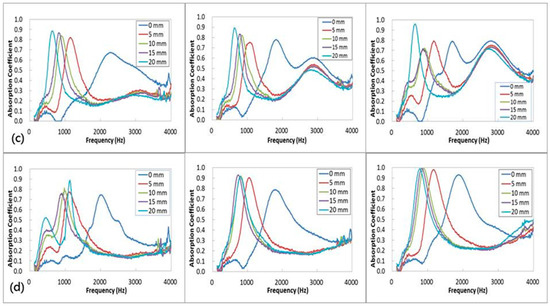 Sound absorption coefficient of PU foam plates in relation to perforation depths of (a) 25%; (b) 50%; (c) 75%; and (d) 100% and the resonance chamber size (0, 5, 10, 15, and 20 mm).
