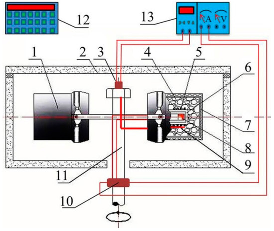 Schematic diagram of the experimental super gravity apparatus: 1. counterpart; 2. housing; 3. thermal couple conductive slip ring; 4. thermal insulation materials; 5. resistance wire; 6. furnace tube; 7. furnace shell; 8. sample; 9. thermal couple; 10. conductive slip ring; 11. rotation axis; 12. rotation controller; 13. temperature controller.