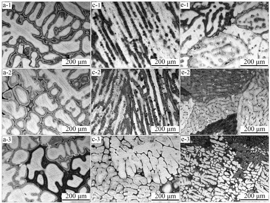 Microstructure of Al-4.5 wt % Cu alloy at different positions of samples in normal gravity and super gravity field: (a-1–a-3) G = 1; (c-1–c-3) G = 300; (e-1–e-3) G = 800. ((1) through (3)) refer to positions 1 through 3, respectively, marked in Figure 2a.