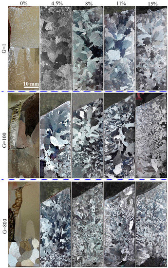 Macrostructure of Al-Cu alloys with varying solute contents in normal gravity field and super gravity field: the subfigures in the first row correspond to samples in a normal gravity field; the subfigures in the second row and the third row correspond to samples in super gravity fields of G = 100 and G = 800, respectively.