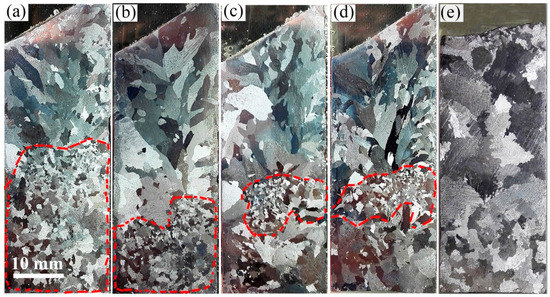 Macrostructures of Al-8 wt % Cu alloy after applying super gravity at different solidification stages by G = 300, ν = 5 °C/min. (a–d) correspond to super gravity treatment at the (b–e) stages of Figure 5.