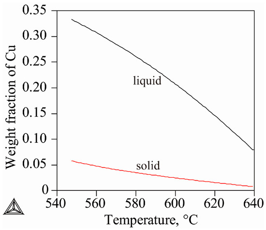 The distribution of solute Cu in solid and liquid phases of Al-8 wt % Cu alloy during solidification, calculated by Thermal-Calc software.