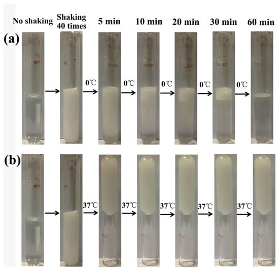 Bubbles in hydrogel solutions after shaking at 0 °C and 37 °C. To confirm that micro-bubbles were blocked in hydrogel at different temperature, hydrogel solutions after shaking were placed at 0 °C and 37 °C, respectively. The hydrogel could hold micro-bubbles in gel during the whole experiment at 37 °C (a). Micro-bubbles dissipated gradually at 0 °C (b).