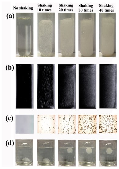 Effects of shaking time on bubbles in hydrogel: (a) bubbles in hydrogel solution recorded with photos; (b) bubbles in hydrogel solution detected by ultrasound; (c) bubbles in hydrogels under microscope; and (d) the floating state of hydrogels.