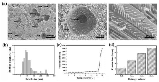 Characterizations of floating hydrogel: (a) the floating hydrogel morphology under SEM; (b) bubble size distribution of the floating hydrogel; (c) viscosity of the floating hydrogel; and (d) erosion time of the floating hydrogel with different volume.
