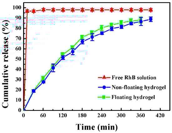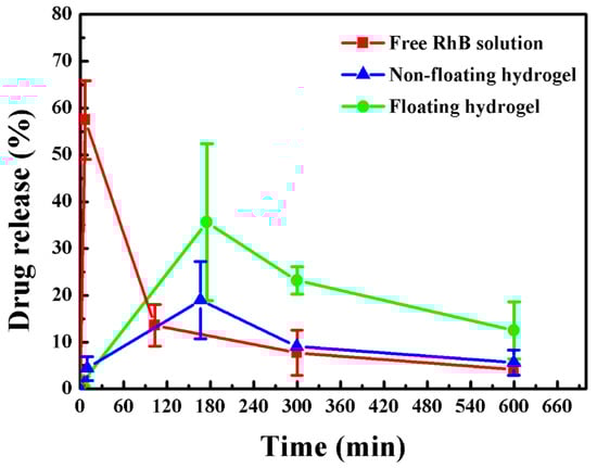 Cumulative release of free-RhB solution, RhB-loaded non-floating hydrogel and RhB-loaded floating hydrogel (Mean ± SD, n = 3).