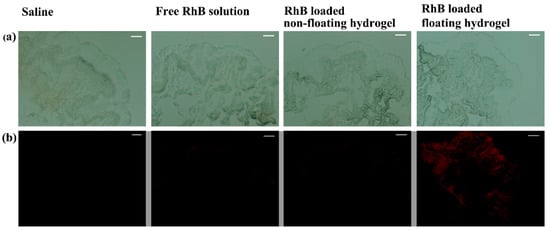 Finally, the residual amount of RhB in rabbit bladder of normal saline, free RhB solution, RhB-loaded non-floating hydrogel and RhB-loaded floating hydrogel groups were investigated (Figure 8). The results showed that the fluorescence intensity of floating hydrogel group was much higher than free RhB solution and non-floating hydrogel groups. No fluorescence of RhB could be observed in the normal saline group. The residual amount of RhB in the bladder tissue was proportional to the fluorescent intensity, so the residual amount of RhB in rabbit bladder of floating hydrogel group was much higher than other groups. Besides, there is no targeted delivery mechanism on the floating hydrogel drug delivery system selectively to the cancer cells rather than the healthy cells. Therefore, the floating hydrogel was a promising drug carrier for raising the efficiency of intravesical administration.