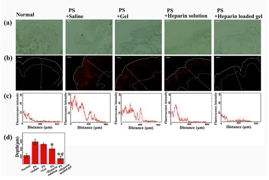 We investigated the efficacy of saline, floating hydrogel, heparin solution and heparin-loaded floating hydrogel groups in preventing the permeation of RhB in protamine sulfate pretreated bladders. The higher permeability of RhB indicated poorer efficacy of drugs. In our experiment, the permeability of bladder mucosa was evaluated by the fluorescence depth of RhB in bladder wall (Figure 9). The fluorescence depth was indicated by the width of fluorescence zone in the bladder wall, and the fluorescence distribution with width was also plotted (Figure 9b,c). Figure 9d showed that the fluorescence depth of RhB in the PS + saline group and PS + Gel group were much larger than the other two groups (p < 0.05), proving the capacity of heparin to reverse the wall leakage that PS caused. Compared to PS + heparin solution group, PS + heparin-loaded gel group showed much poorer permeation of RhB (p < 0.05), with width similar to control group, indicating better efficiency of heparin. Because the time of first voiding of all groups were 2~10 min, and the heparin solution was eliminated during that time. However, floating hydrogel could stay in bladder and continued to release heparin, largely improving the efficacy of heparin. Therefore, the floating hydrogel system could successfully extend the residence time of drug and hence enhance drug efficacy.
