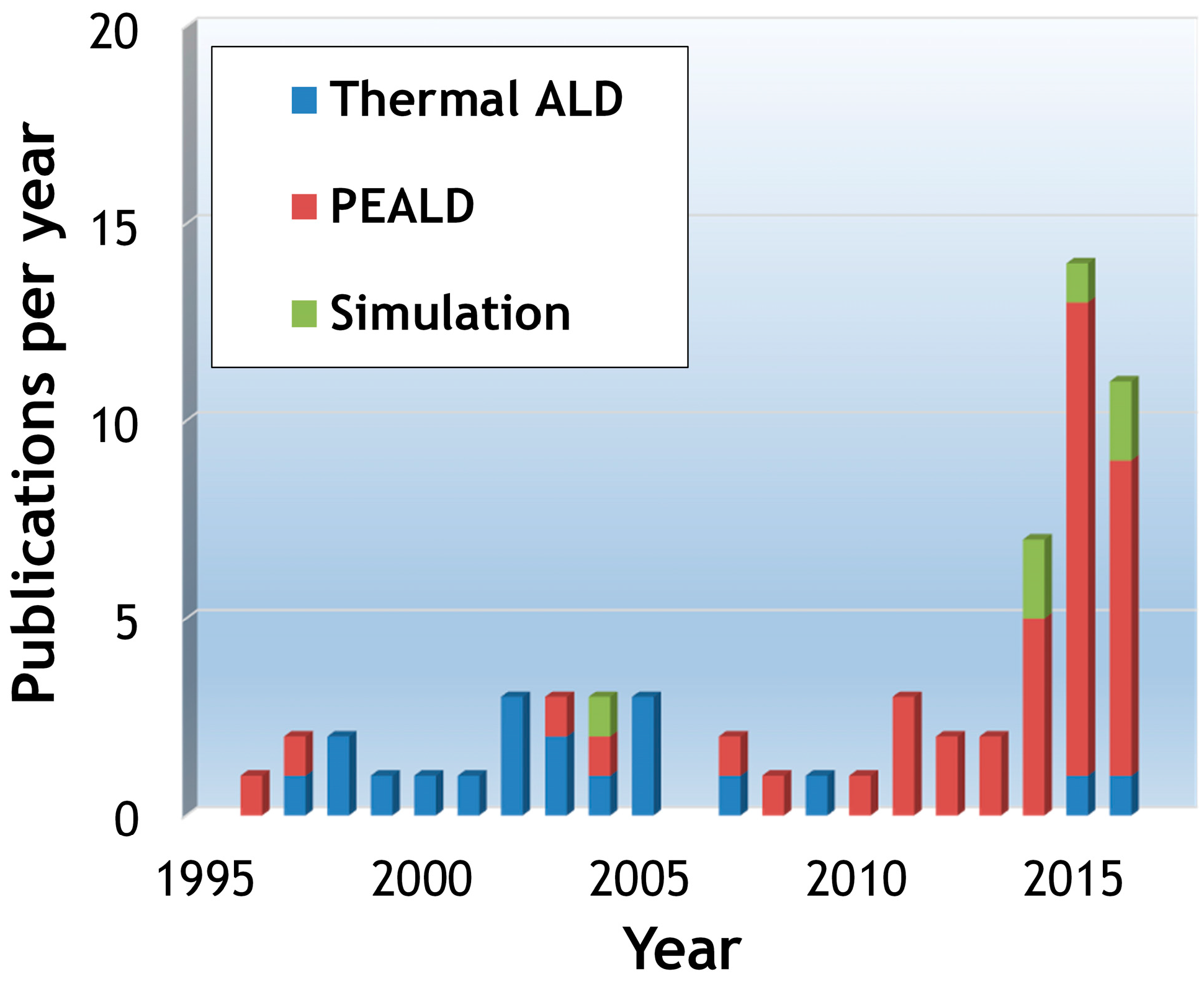 Number of publications per year with respect to atomic layer deposition (ALD) of silicon nitride (SiNx) since the first report by Goto et al. was available in 1996 [16], as retrieved in the Web of Science and Google Scholar (through 31 July 2016). The key words for searching included the combination of “atomic layer deposition/atomic layer CVD/plasma-enhanced ALD/plasma-assisted ALD/ALD/PEALD” and “silicon nitride/Si nitride/Si3N4/SiN/SiNx”. Irrelevant publications were not considered.