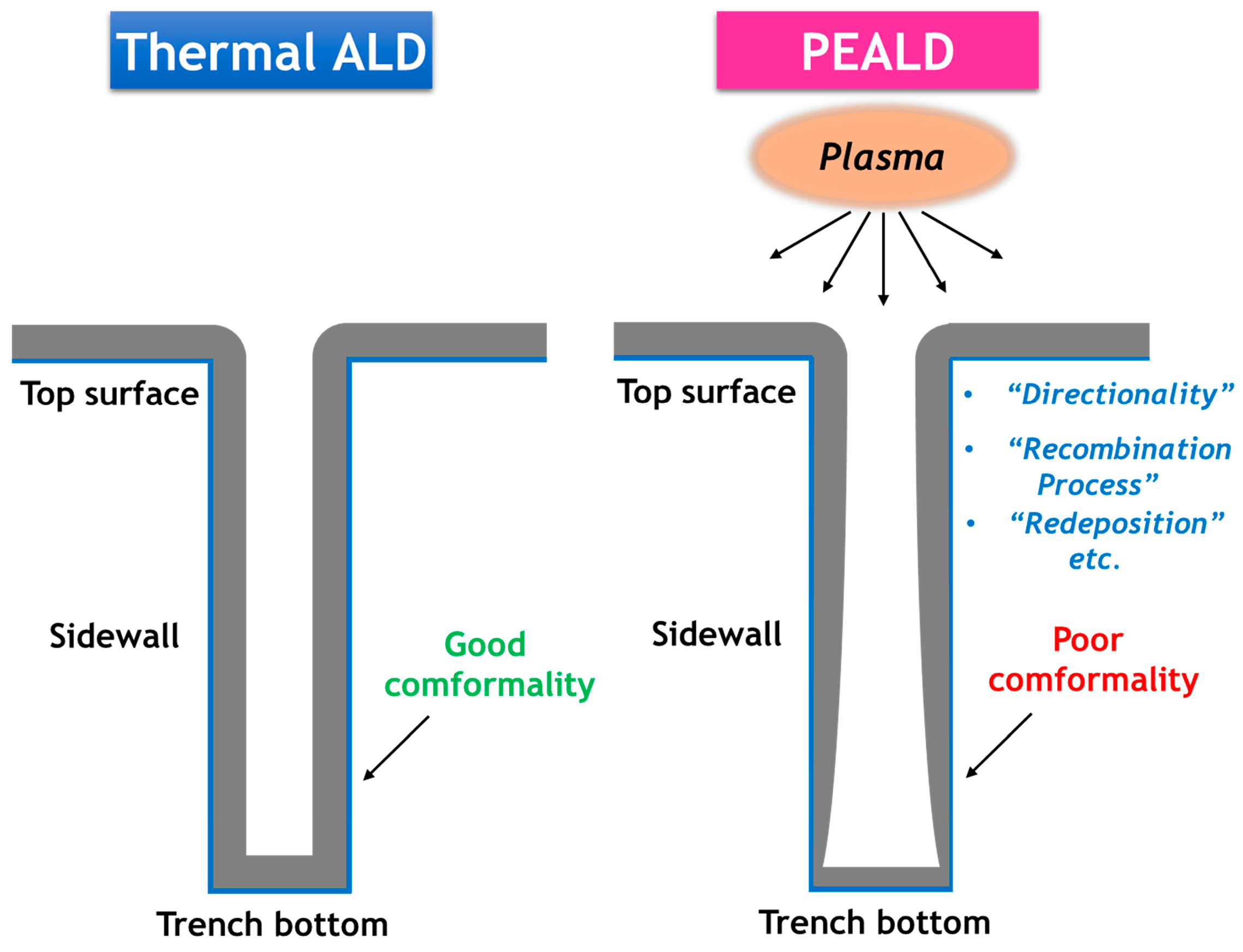 Schematic diagram of conformality degradation in PEALD, in comparison with thermal ALD.