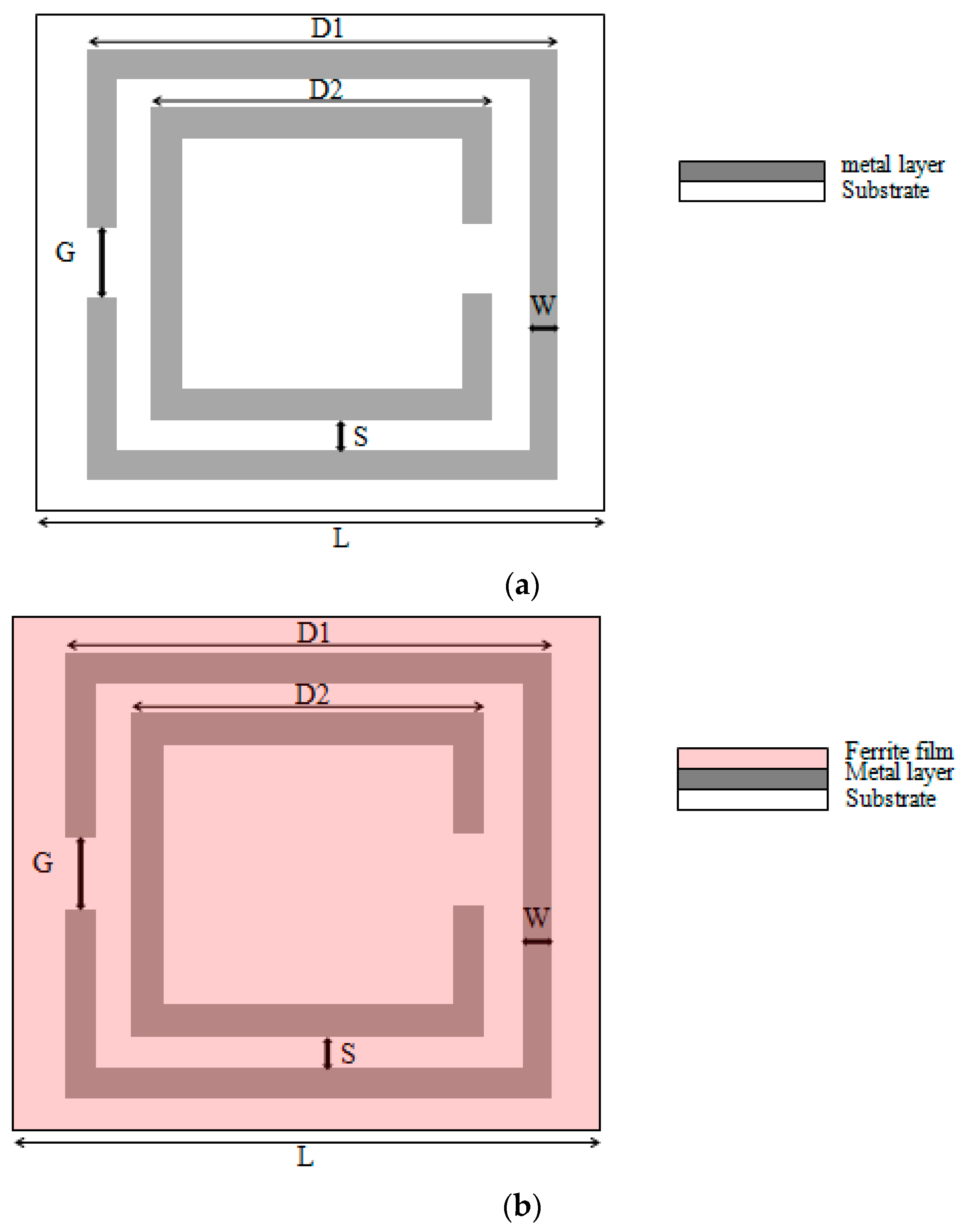 Schematics of the split ring resonator (SRR). (a) The metal conductive traces are on the dielectric substrate. The unit cell size is 25 mm × 25 mm; (b) The metal conductive traces are on the dielectric substrate. Another layer of ferrite film is attached on the metal layer. The unit cell size is 25 mm × 25 mm. D1: outer length of the SRR; D2: inner length of the SRR; G: split width in the rings; W: width of the ring trace; S: distance between the rings; L: unit cell size; t: thickness of the substrate; : The permittivity of the substrate.