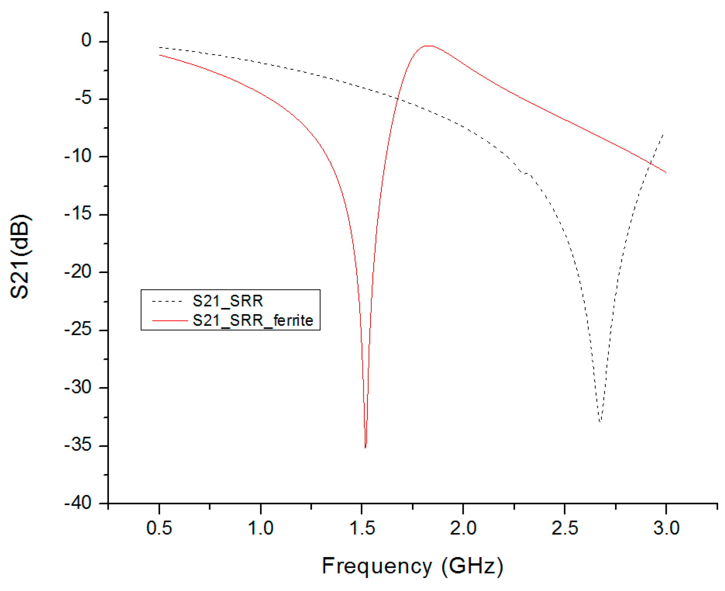 Simulation results of the S21 parameter of the SRR unit cell and SRR-ferrite unit cell. The resonant frequency of the SRR unit cell was about 2.68 GHz. For the SRR unit cell loaded by ferrite, the resonant frequency was about 1.5 GHz.