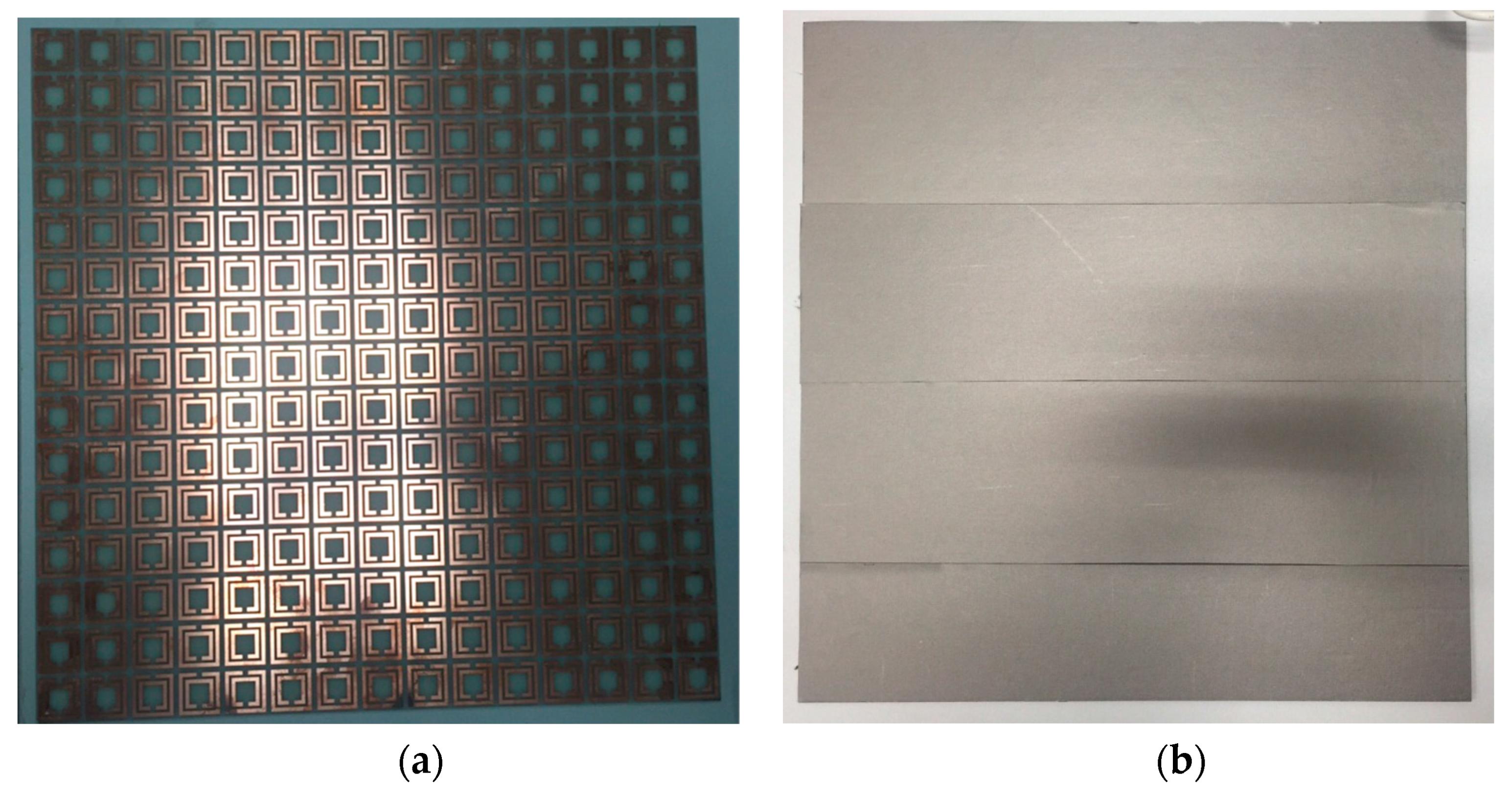 The metamaterial with the SRR cell was fabricated on a PCB board, where the dielectric material was FR4 with a dielectric constant of 4.4. Two prototypes were fabricated for comparison; One with a layer of 0.3 mm thick ferrite film attached on the surface of the SRR metamaterial, as shown in Figure 5. The film covered the whole area of the SRR metamaterial. The other prototype had no ferrite film, but had an identical SRR structure. A repetitive array of 15 mm× 15 mm SRR unit cells were fabricated on the FR4 substrate. The size of the thin slab was 375 mm × 375 mm × 1.6 mm. The conductive copper trace thickness was 35 um.