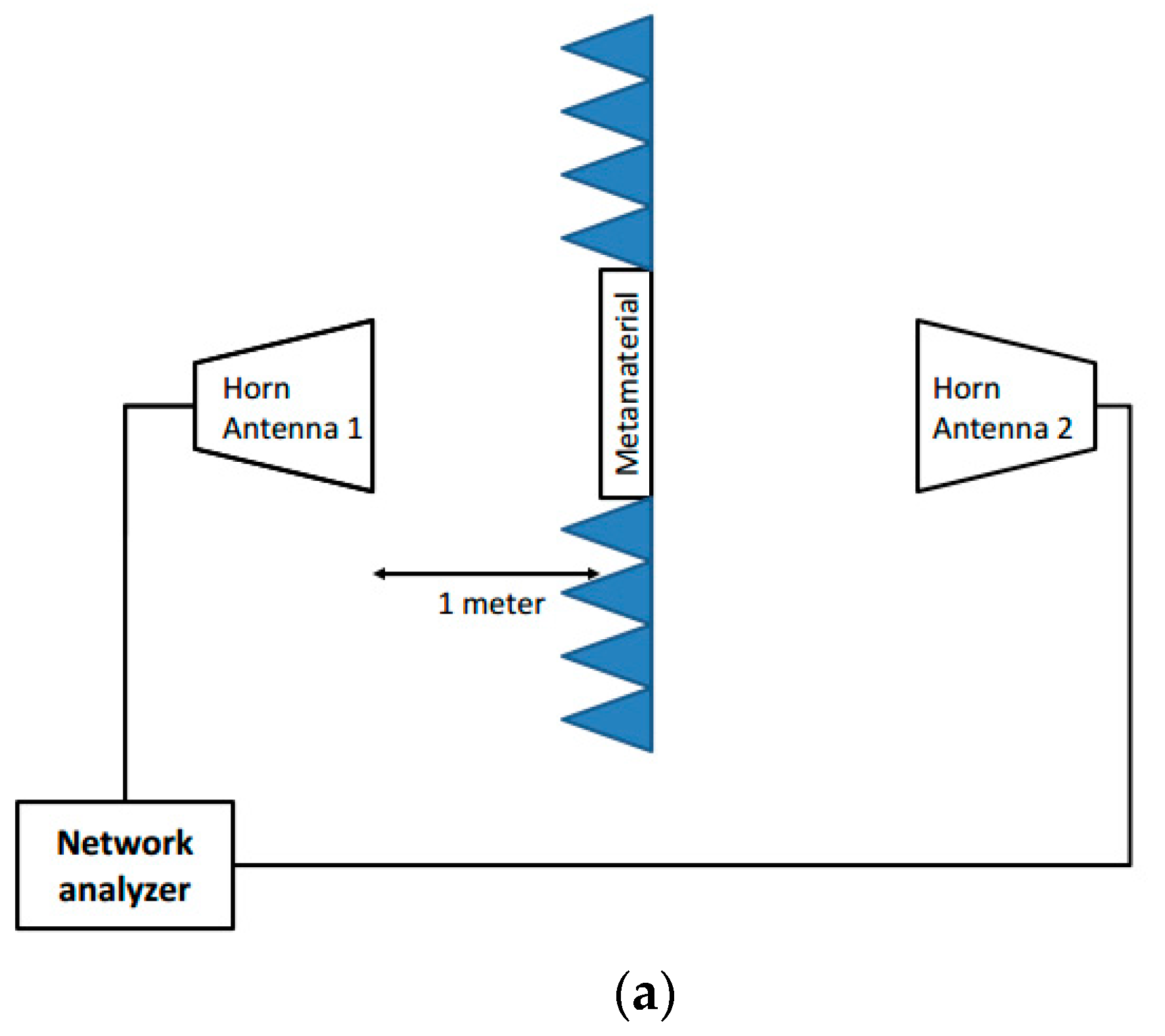 Measurement setup (a) schematic of the measurement setup. The metamaterial is surrounded by microwave absorbers. Two horn antennas operating from 0.8 to 8.0 GHz are used to transmit and receive signals. The network analyzer connects the two horn antennas. The distance between the metamaterial and both horn antennas is 1 m. Photo of the test setup. The measurement is conducted in an anechoic chamber to eliminate external measurement noise. (b-1) the SRR slab and (b-2) the SRR covered by 0.3 mm thick ferrite film.