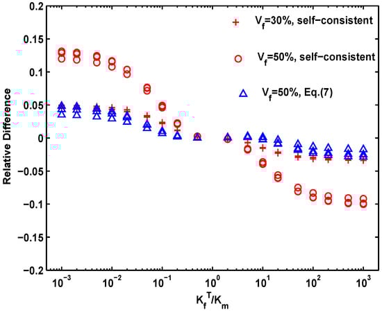 However, above models are developed on the assumption that the heat flux through the single fiber is not affected by the others, thus these developed formulae are valid only for dilute fiber concentrations. At higher volume-fractions of fiber, these formulae are approximate or even erroneous, for the local temperature fields around the fibers will interact. The differences between the calculated transverse thermal conductivity of two-phase model (as shown in Figure 2b) and the prediction of self-consistent formula with the fiber-to-matrix conductivity ratio are shown in Figure 4. The relative differences (RD) between both are illustrated by the following function: