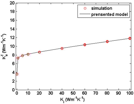 where Ki is the thermal conductivity of the interfacial layer. Substituting Equation (12) into (6), the transverse thermal conductivity of the three-phase system can be estimated. To validate this model, by setting = 3 W·m−1·K−1, Km = 20 W·m−1·K−1, Vf = 0.5 and Vi = 0.05, the transverse thermal conductivity of the three-phase system (as shown in Figure 2c) with Ki values are calculated and shown in Figure 5. It is clearly shown that the presented model gives a good fit to our simulation results.