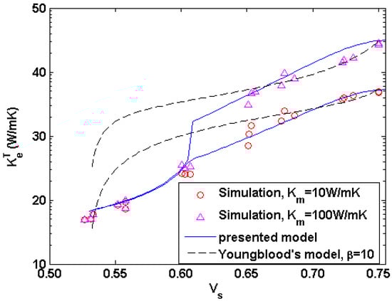 To validate the presented model, by assuming the perfect interface conductance and setting = 1 W·m−1·K−1, Ki = 40 W·m−1·K−1, Km = 10 and 100 W·m−1·K−1, Kp = 0.01 W m−1·K−1, Vf = 0.5 and Vi = 0.05, the transverse thermal conductivity of the densified microstructure with the solid volume fraction during the CVI process are calculated and compared with the presented and Youngblood’s expressions [35] in Figure 7. In Youngblood’s model, the thermal conductivity of matrix containing pores can be estimated as the one of homogeneous media, by the Maxwell-Eucken expression: