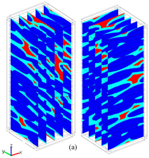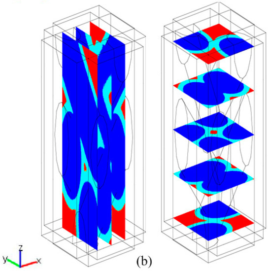 The simulated structure for 2D woven composites is shown in Figure 8a. In the constructed unit cell, we assume 2D woven composites are composed of the fiber tows with elliptical section, the tows follow a sinusoidal path and ten laminates are randomly stacked in 0°/90° sequence. By fixing the ratio of the gap width to the tow width between two adjacent tows in the longitudinal direction as 0.20 and varying the ratio of tow width to tow thickness, e from 5 to 10, the initial macro-porosities of the simulated structures are 0.28–0.32, which is consistent with the experimental data [43]. Thus, the simulated structures adopting these geometric parameters are considered to be appropriate for the estimation of the thermal transport properties. For convenience of illustration, the longitudinal and through-thickness directions are considered as the x and z directions, respectively. The simulated structure for 3D braided composites is shown in Figure 8b. In the constructed unit cell, Chen and Choy’s analytical model [44] is adopted and the braiding angle is setting as 20°. For convenience of illustration, the transverse and longitudinal directions are considered as the x and z directions, respectively.