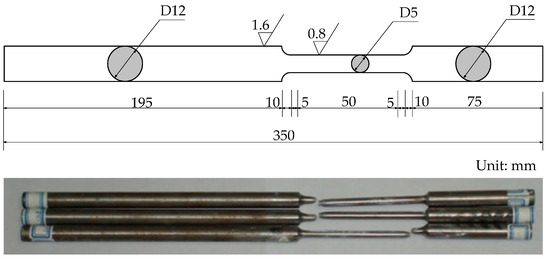 Tensile testing was performed for rebar samples HPB235, HRB335, HRB400, and HRB500 at four strain rates using two test facilities at room temperature. Quasi-static testing was carried out using a universal electromechanical CSS-44500 testing machine (Changchun Research Institute for Mechanical Science Co., Ltd., Changchun, China) with a maximum load bearing capacity of 100 kN. Dynamic testing was conducted using a servo-hydraulic Instron VHS160/100-20 (Instron, Grove City, PA, USA) with a maximum load bearing capacity of 100 kN. This machine is particularly designed for elevated strain rate testing with preset tensile speeds. Round dumbbell-shape samples were fabricated with 50 mm length in the middle portion and 5 mm in diameter, as illustrated in Figure 1. These specimens were processed using rebar grades for HPB235, HRB335, HRB400, and HRB500 of 12, 14, 25, and 22 mm diameters, respectively, due to the limited load bearing capacity of the test machine. The strain rates ranged from 2 to 80 s−1 and were preset to three strain rate levels. For each preset strain rate level, three specimens were tested for the individual rebar grades to minimize the result variation. Table 1 presents the main chemical composition of the four rebar grades.