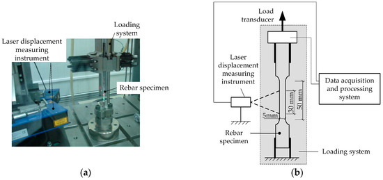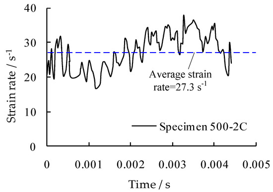 The quasi-static tests were conducted with a strain rate of less than 0.0003 s−1, in accordance with Chinese standards [16]. Figure 2 presents the test system for reinforcing steel bars under elevated strain rates. The specimen was clamped at both ends and tensioned under an approximate constant strain rate to failure. Figure 3 presents an example of the resulting strain rates varied within a small range during testing for specimen 500-2C. Particularly, a laser displacement measuring instrument was used to detect the length changes within a gauge length of 30 mm with a sufficient high frequency of 390 kHz. A load transducer in the test system recorded the tensile loads. The data were in a real-time historical form, and the output was from a data collection and processing system that could take in various forms including stress-strain curves.