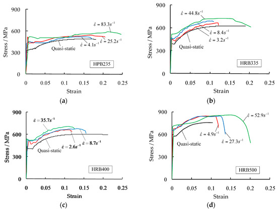 Typical stress-strain curves for the four rebar grades at different strain rates: (a) HPB235; (b) HRB335; (c) HRB400; and (d) HRB500.