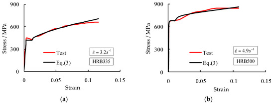 Typical stress-strain curves obtained from testing and Equation (3) for rebar grade HRB335 at a strain rate of 3.2 s−1 (a) and for rebar grade HRB500 at a strain rate of 4.9 s−1 (b).