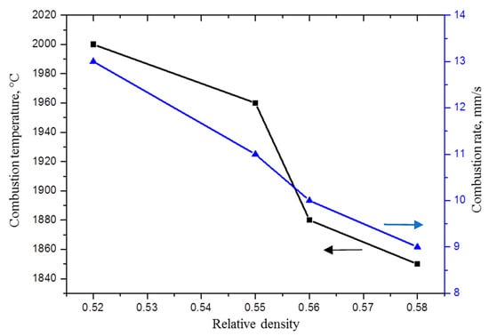 The adiabatic combustion temperature of the system was 2200 °C. Under the real high-temperature deformation conditions, the combustion temperature decreases from 2000 to 1800 °C as the relative density of the charge sample increases from 0.52 to 0.58. (Figure 1).