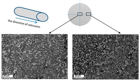 The microstructure of the cross section of the extruded material is similar at various strains and consists of titanium boride particles (Figure 2, dark gray regions) located in a titanium matrix (Figure 2, light gray region). Based on the reported data [16], we found that the (010) predominant growth of a titanium monoboride crystal causes the formation of TiB in the form of fibers or whiskers, the length of which is much larger than the transverse sizes. In the cross section, the fibers form hexagons faceted by planes (100), (101), and (101−). The TiB grains at the sample surface in the microstructure of the synthesized materials have a predominant longitudinal orientation because of high stresses directed along a material flow and friction on the die walls. These grains have an irregular polygonal shape in the cross section and sizes from 1–2 to 5–6 µm. Lower stresses are operative in the central part of the sample, and TiB fibers are oriented along a material flow to a lesser extent and are directed along two directions. Grains at the center coarsen due to slower heat removal in cooling as compared to the sample surface. The grain sizes in the cross section are up to 8–10 µm, the fiber thickness in the (010) longitudinal direction is from 1 to 2–5 µm, and the fiber length is from 2–3 to 40–45 µm.
