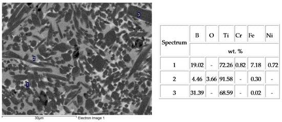 Iron, chromium, and nickel impurities in the initial components are detected over the polished section area (Figure 3, spectrum 1); as follows from EDS (energy-dispersive X-ray spectroscopy) data, their content is at most 5 wt %. The results of energy dispersive analysis and XRD demonstrate that oxygen dissolves in molten titanium to form the Ti6O solid solution during synthesis and subsequent high-temperature deformation (Figure 4a). Energy dispersive analysis shows that the mass fraction of oxygen in the solid solution is at most 4%–5% (Figure 3, spectrum 2). For comparison, we synthesized a similar material without high-temperature deformation in air. The synthesized material consisted of six phases, and the main phases were titanium monoboride TiB, titanium nitrides TiN and TiN0.3, titanium oxide TiO2, and Ti3B4 (Figure 4b). The main fraction of titanium oxides and nitrides concentrated at the material surface. The initial mixture composition was calculated to form the end material TiB—30% Ti; however, excess boron appeared due to the high chemical activity of titanium and its interaction with the air components. As a result, additional phases TiB2 and Ti3B4 appeared. Although contact of air with the reaction zone is hindered during SHS extrusion, oxygen dissolves partly in titanium to form the Ti6O solid solution during synthesis and subsequent high-temperature deformation. Note that the material synthesized by SHS without deformation had a porosity of 45%–50%, and the distribution of the structural constituents over the volume was non-uniform. Combustion followed by high-temperature deformation leads to a uniform distribution of the structural constituents and to a decrease in the porosity to 2%–4%.