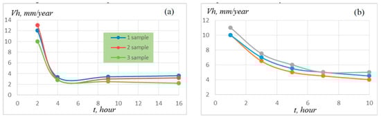 The actual speed of the penetration corrosion (Vh) is the time derivative of the uniform corrosion depth as a function of time. It was calculated as follows: