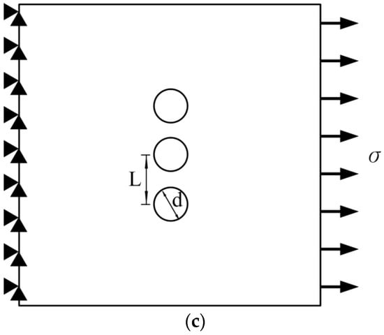 Schematic diagrams of geometries used in simulations: (a) specimen with single hole; (b) specimen with two holes and (c) specimen with three holes.