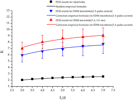 During fitting, the obtained coefficient of determination, R2, was 0.735, 0.776 and 0.8 for specimens with one, two, and three EDM holes, respectively. The empirical formulas provided a suitable description of the relationship between the stress concentration factor and EDM pulse current. To verify the validity of the correlation empirical formula, stress concentration factor values calculated using the correlation empirical formula were compared with those obtained using the FEM analysis results. The average difference between the two was 1.01%, 1.2%, and 2.7% for specimens with one, two, and three EDM holes, respectively. Therefore, values calculated using the proposed formulas were in good agreement with the FEM results, and the formulas can be used to determine the appropriate EDM pulse current for different applications.